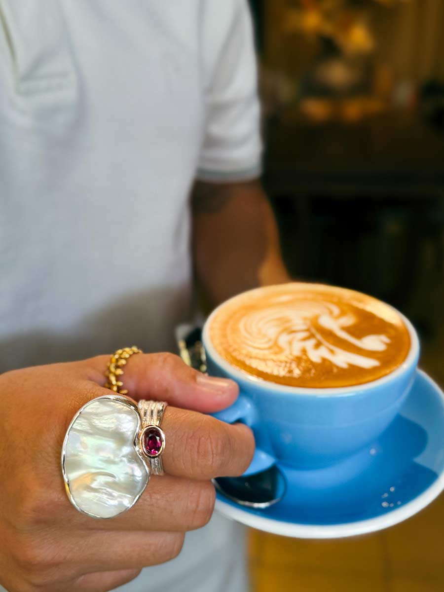 Coffee is a conversation storyteller, and so is jewellery. Each cup asks: where have you been? Each ring answers: here is what the world taught me.