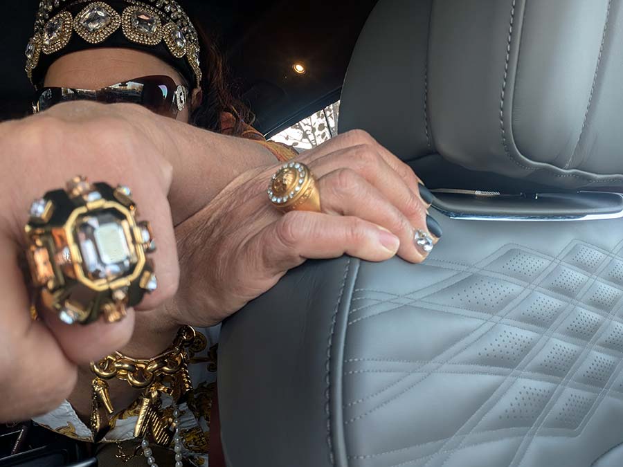 The Swarovski magic extends to my eyewear, vintage acetate frames adorned with pearls, because if I’m driving the most luxurious SUV on the planet, I need eyewear that does more than shield the sun—it must dazzle.