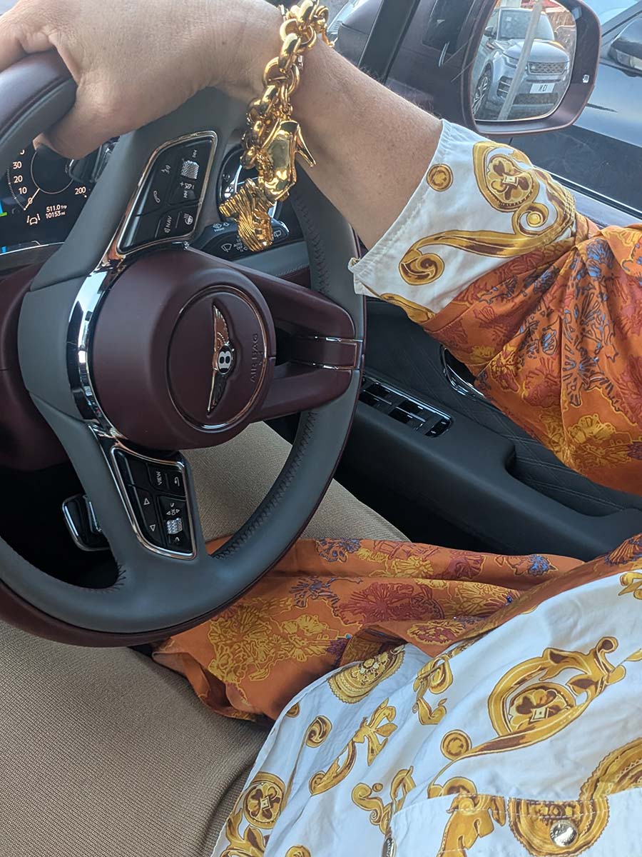 Whether it’s a vintage Salvatore Ferragamo charm bracelet or pearl eyewear, every piece I wear whispers a story of rarity and refinement. That’s the key to styling for a Bentley—curating pieces that are as exclusive as the car itself.