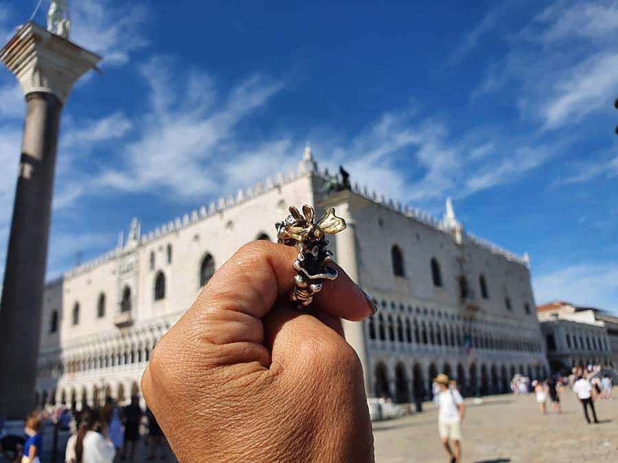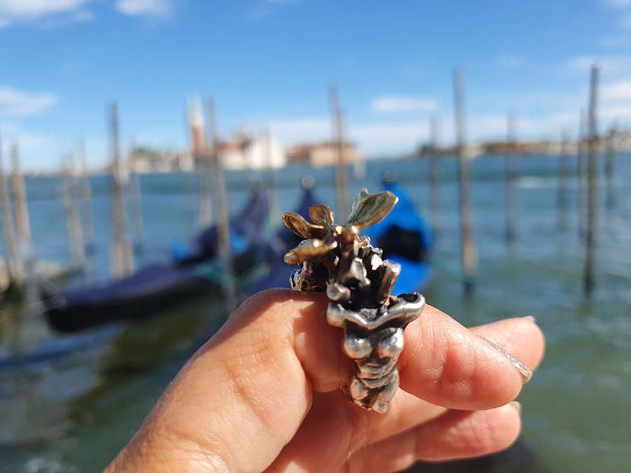 The ring was also inspired by the 2019 floods. Valeria and Venice shops experienced the biggest floods they have ever seen. Nature has no favour, nor mercy no matter who you are. Then came the biggest storm of all, no tourists. Venice foot traffic had plummeted to zero. Valeria, a woman who designs from passion and heart, is never defeated by this cities lagoon.