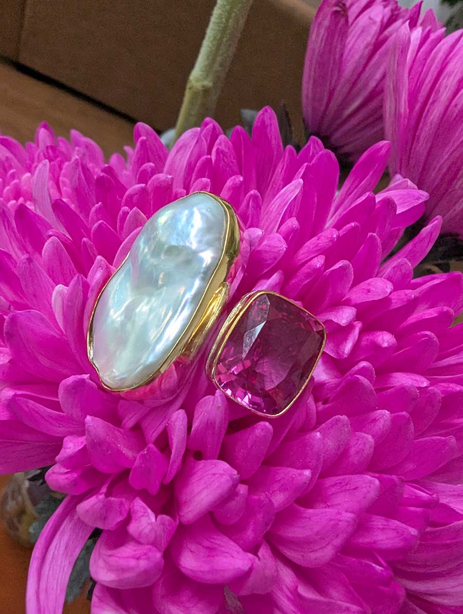 The Gracie Opulanza Baroque Collection is not designed in a studio alone. It is shaped by journeys, border crossings, conversations with artisans, and moments of wonder found in markets, temples, and riversides. This particular ring — crafted in silver with a gold surround framing a Cambodian gemstone and paired with a Vietnamese baroque pearl — is a piece of wearable travel history.
