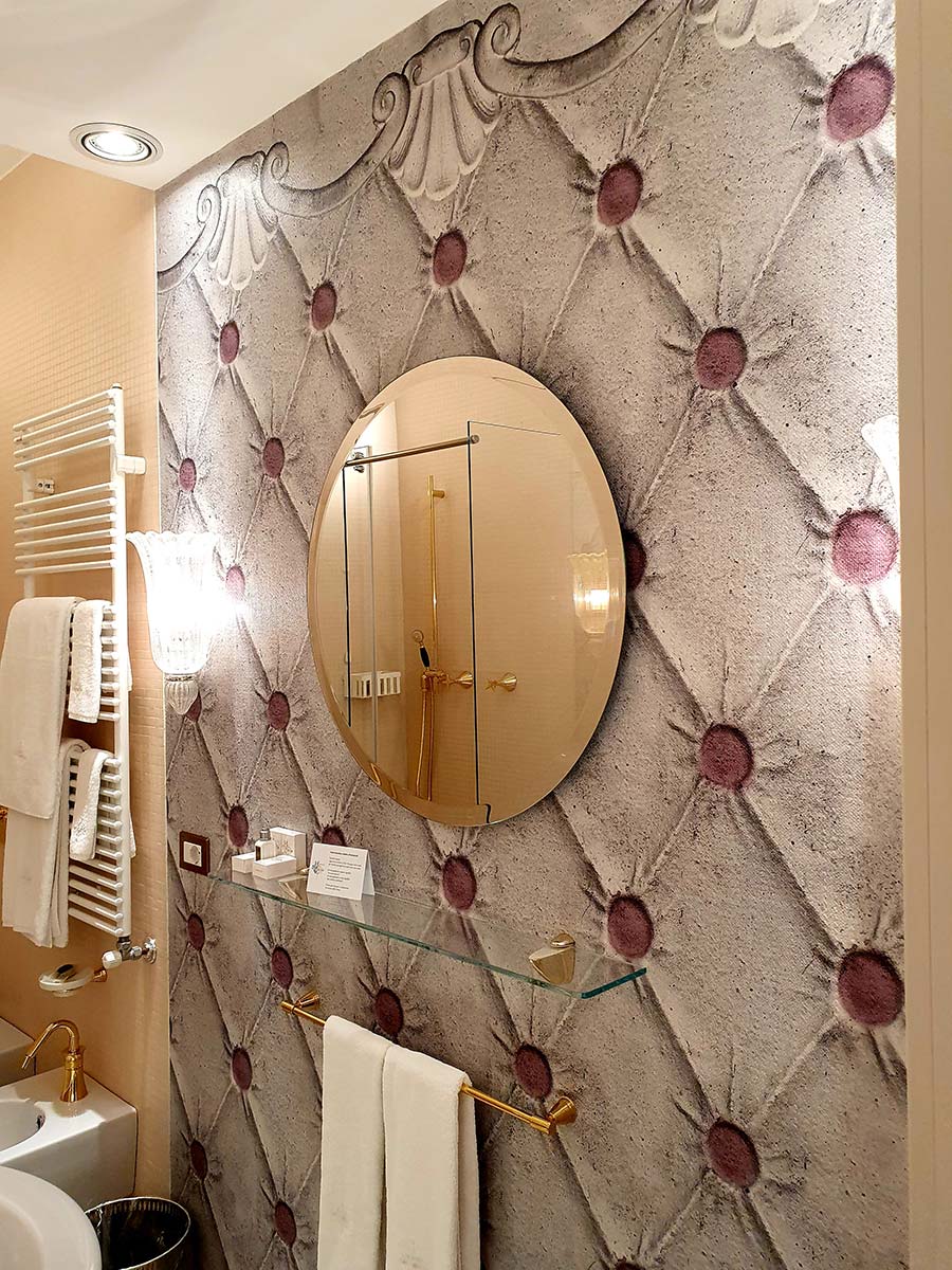 Look at the tiles behind the sink it is a true message of being in Venice in a palazzo it belongs to this room alone. That is a bathroom luxury hotel experience. I want to escape when I am in a hotel bathroom suite.