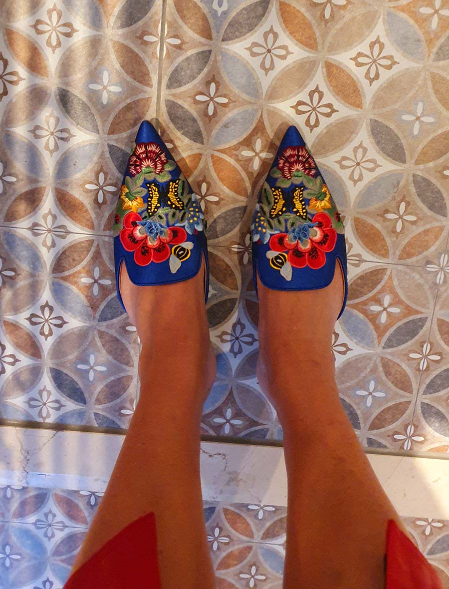 I joined forces wearing my Versace shirt and Alberta Ferreti mules.