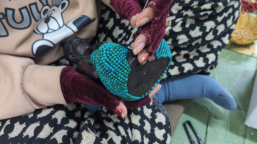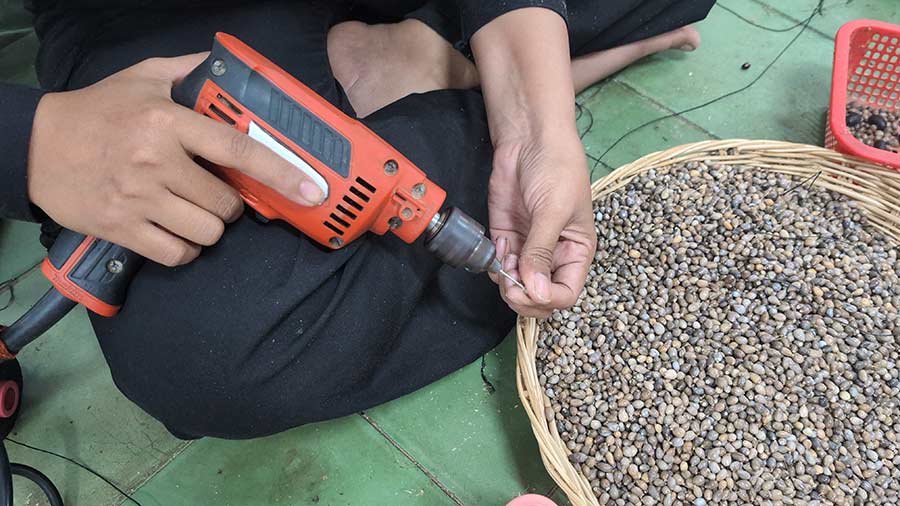 Each piece is handcrafted by local women artisans, assembled bead by bead in Cambodian workshops. The process is meticulous and slow. Seeds are cleaned, polished naturally, sorted by size and tone, then arranged into intricate patterns that feel both tribal and contemporary. No two pieces are identical, which is precisely the point.