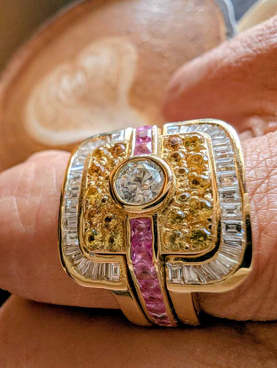 Because I was born in Australia — a land where sapphires run deep in the earth, where colour matters, where individuality is not questioned but expected. So I chose sapphires — yellow and pink. Not safe. Not predictable. But alive. Vibrant. Unapologetic.