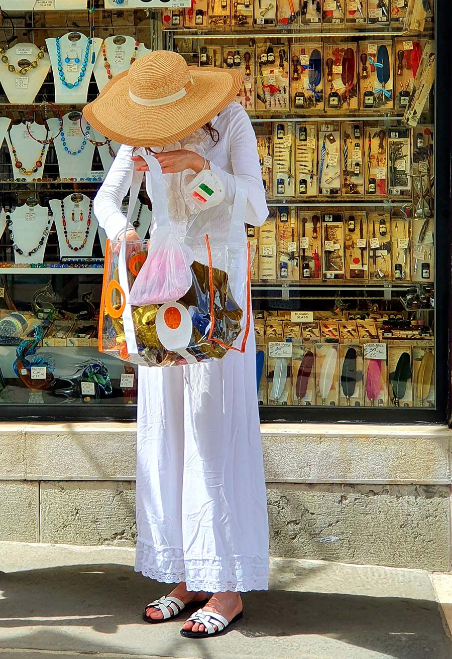 I noticed that in Venice women, like to accessorise wearing white with opposite colours, like black.